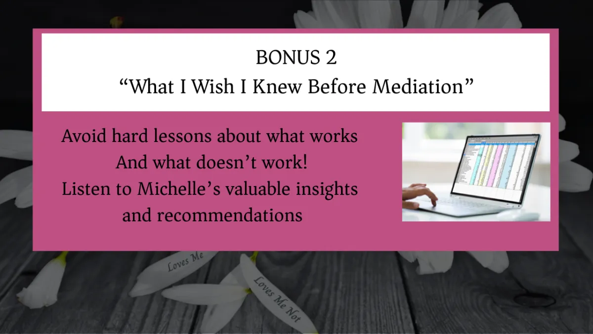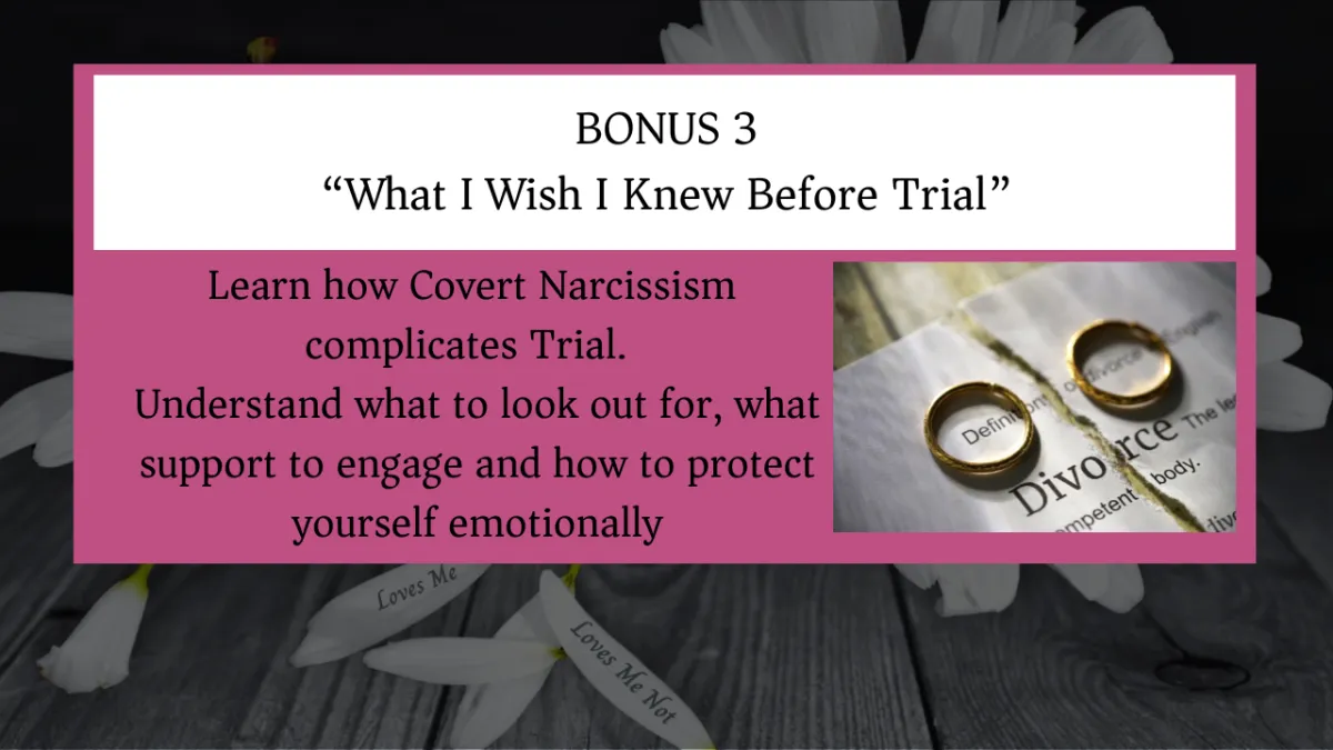 You’ll get access to my insight, lessons, and proprietary process to navigate both the legal and emotional implication of separating from a Covert Narcissist